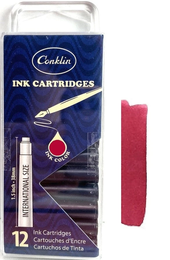 12 Conklin fountain pen ink cartridges that will fit any Conklin pen that utilizes a cartridge filling system.